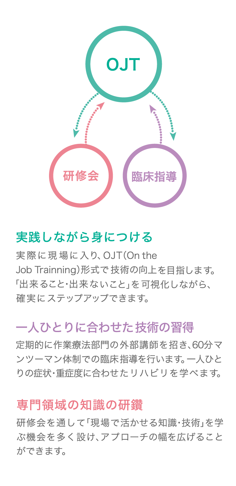 このように2人のプリセプターが連携・協力しながら、新人セラピストの自立を細やかにサポートすることで、これからの時代を担う「人間性・専門性を兼ね備えたスペシャルワン(セラピスト)」を育成します。