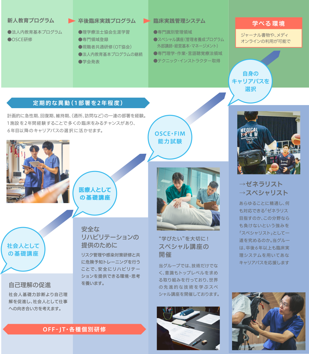 R&Oリハビリ病院グループは、様々な職種や段階に応じた人材教育システムを通じて、