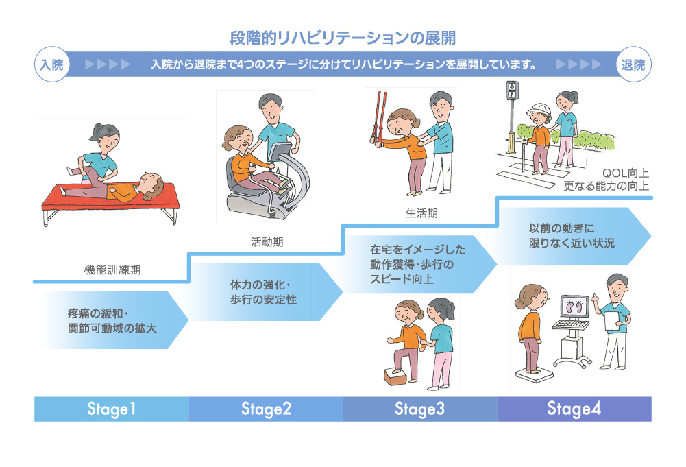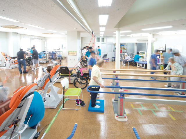 当院は、1年365日、土日もお正月も休むことなく、1日2〜3時間の機能回復訓練、リハビリテーションを実施しています。また、患者様の1日も早い回復をサポートします。